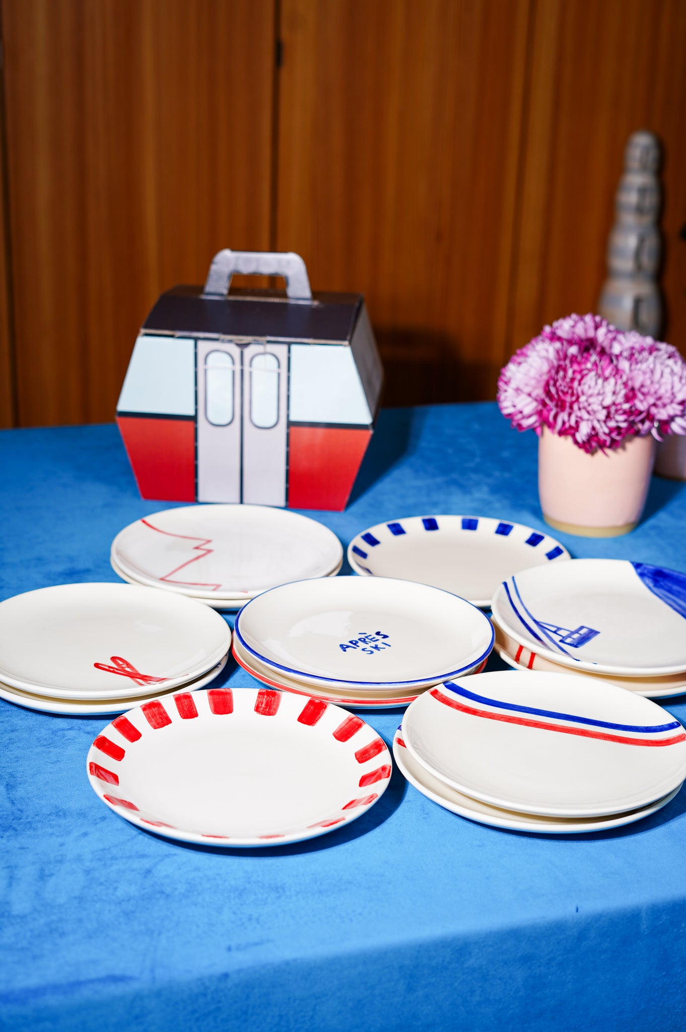 Vier reeksen, telkens 12 rood-blauwe borden die de charme van besneeuwde bergtoppen uitstralen. Perfect formaat van 22,5 cm voor ontbijt, voorgerecht of dessert — en instant gezelligheid op tafel.