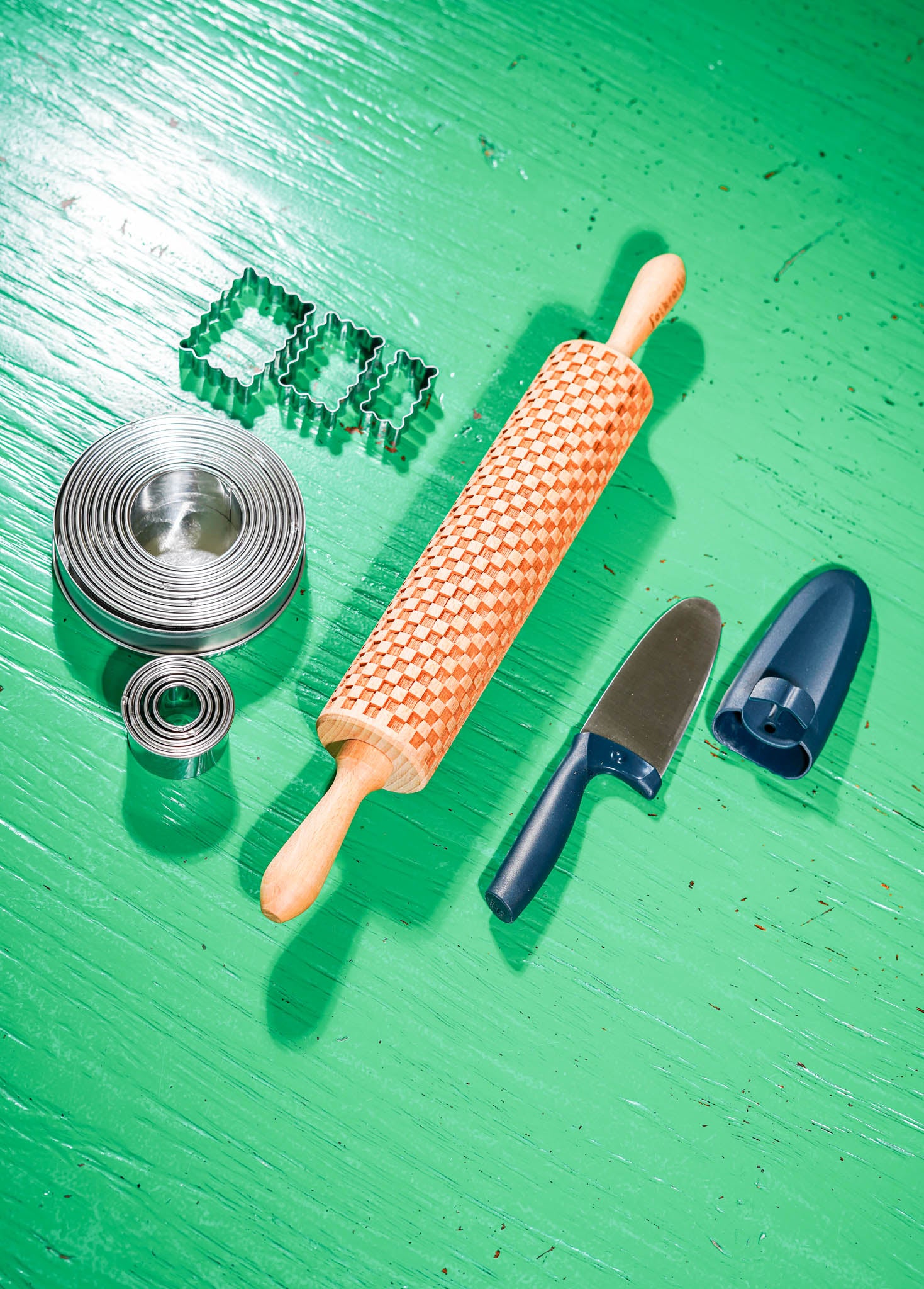 Deze set is gemaakt voor jonge bakkers die graag zelf de touwtjes in handen nemen. Met een stevige deegrol met een cool dambordpatroon, een veilig kidsmes , een set rechthoekige uitduwvormpjes in petit beurre-stijl en een ronde uitduwset in verschillende maten, kunnen ze helemaal los.